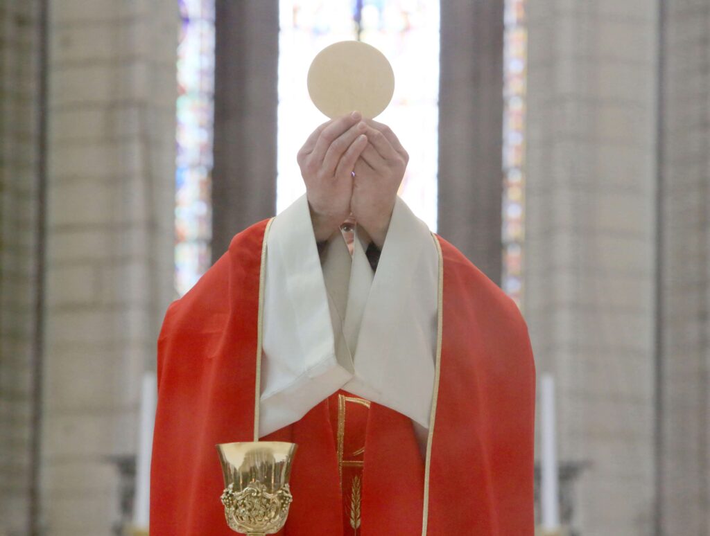 En disant cette « parole de gloire », le prêtre élève le calice et la patène. Un geste magnifique d’offrande du Fils au Père dans l’Esprit Saint. Cette élévation renvoie directement à la croix sur laquelle le Christ a été élevé de terre pour sauver le monde, à sa résurrection. Puisque tout a été fait par le Christ, c’est toute la création que nous élevons vers le Père en offrant le Corps et le Sang de son Fils.
