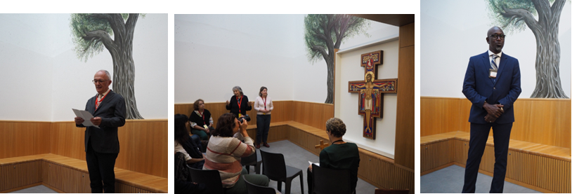 Carol Beytrison a ensuite présenté l’icône inspirée de la croix de San Damiano, cachée dans la paroi coulissante qui permet de sortir différents symboles en fonction de la religion de la célébration. Il s’agit d’une magnifique et grande icône en bois réalisée par l’artiste iconographe Agnès Glichitch, dans le cadre d’un projet qui a réuni l’Aumônerie œcuménique des prisons et la Pastorale du monde du travail de l’Église catholique romaine à Genève. Elle accompagne les célébrations chrétiennes.