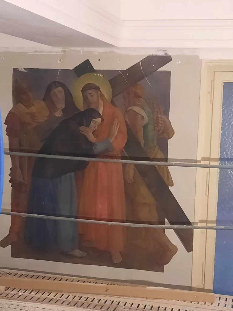 Le travail de préservation, conservation et restauration des restaurateurs sur le chemin de croix vient tout juste de débuter et va se poursuivre pendant plusieurs mois. En effet, certaines de ces peintures murales ont souffert des infiltrations d’eau des moyens d’extinction de l’incendie et des efflorescences salines survenues lors du séchage.